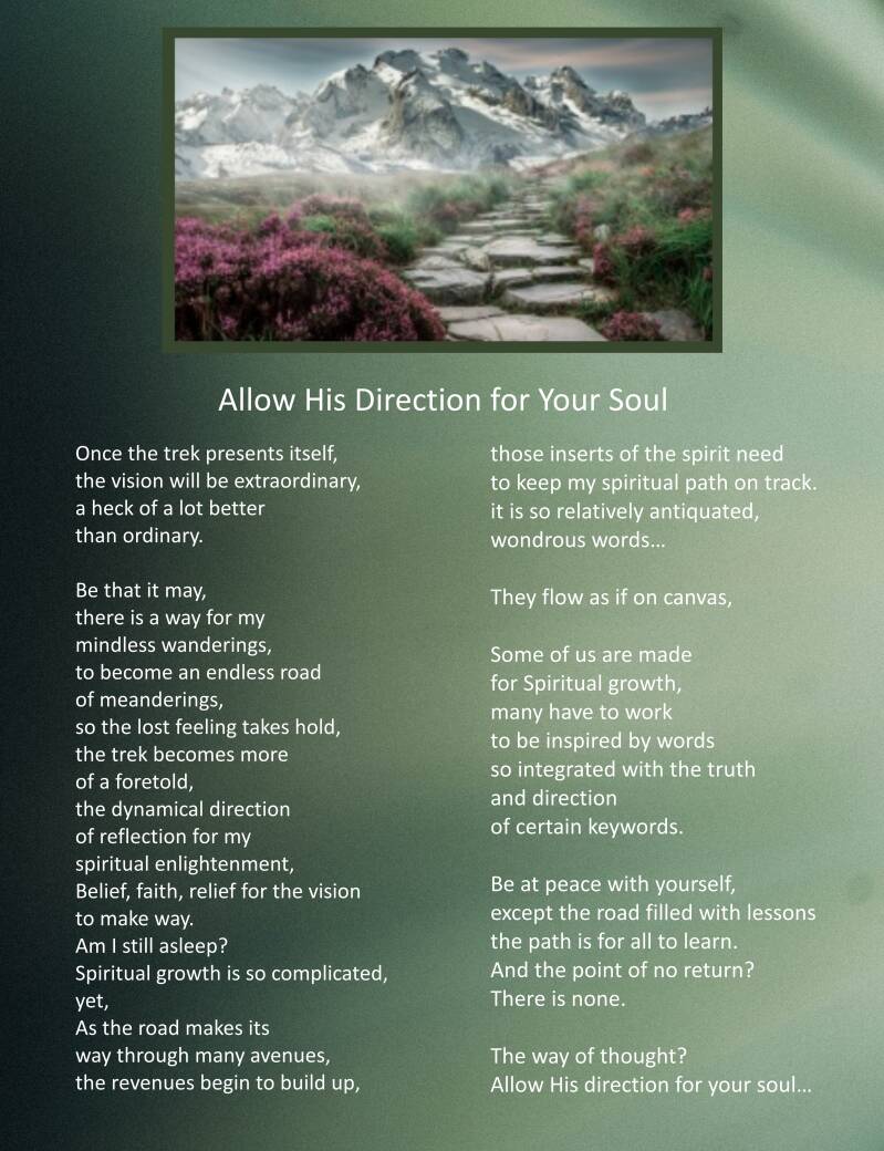 It all comes about when you know the spiritual dynamics of life and your own personal beliefs, and the destination of your soul’s portal into the universe’s domain. Thus, the entrance of His domain is also a part of your soul’s findings, then all the truths make their way to you, and the following of the journey becomes an easier task at hand. We all have to make choices. When one is allowed in life to make a directional move, the choice then is made as to how one goes about it. Sometimes, it is not an easy choice to make. A love lost may have to be done, or better yet, a found love for one’s path has come to be the choice. These moments of choice are made for many aspects of life for us to follow down a road through life. Living as we do, the path will become evident, and the choice is made in how the path comes about. Like I mentioned, it could be a hard journey to follow, or a wonderful ending with a choice for the betterment of one’s life. Many facets make up a choice, and the dynamics of how it comes through the spirit. If one can be attentive to the spiritual side, one’s dealings with the Great Spirit, in prayer, and the voice through meditation, that can become a formidable key to how life comes about. He is there for us and will be the light of our life, even in the darkness of clouds sometimes hanging over our path, making the vision difficult to see or understand. But He will be near; one’s faith is the way through these harsh times. The belief will follow the given spirit it has a hold of, thus, they both make the road’s many avenues of lessons. Each through a door, one moment at a time, in thought, as the listening of the voice to the Great Spirit comes about.
